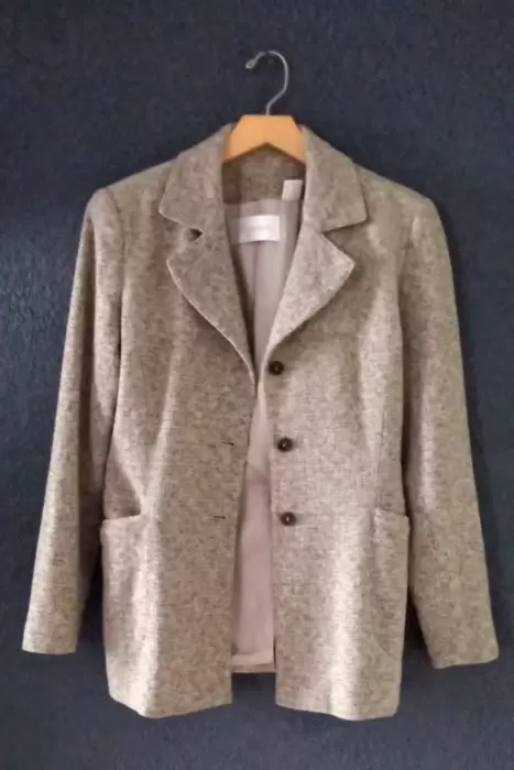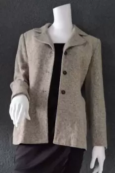 Chaqueta Dana buchman. Chaqueta/ Abrigo corto, talla-6 Color beige, corte amplio, con bolsas en los costados yMedio cinturon en la parte de atras.Da a una talla mediana,