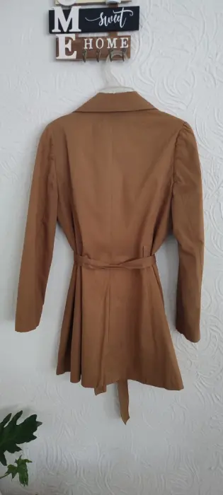 Gabardina color camel. Gabardina de manga larga, corte ajustado con cinturón, forro, bolsas a los costados y botones delanteros, tela ligera y cómoda. Poco uso y en buen estado.