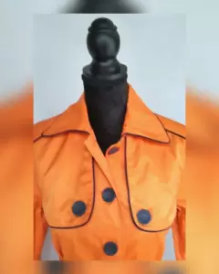 Gabardina Ligera Bien en Contraste. Gabardina ligera color CALABAZA, cuello clásico c/solapas, 2 solapas antitormenta frontal, cierre p/botonadura, 2 bolsillos frontales c/tapeta, cinturón mismo tejido p/mejor ajuste, bies en contraste tono NEGRO ÉBANO y forro interior. Talla M. Dimens cms: 39 hombro, 50 axila, 43 cintura, 59 zona baja, 79 largo, 64 largo manga. 55% algodón, 45% poliéster. P/lavado en casa.***NO ES IMPERMEABLE***