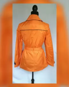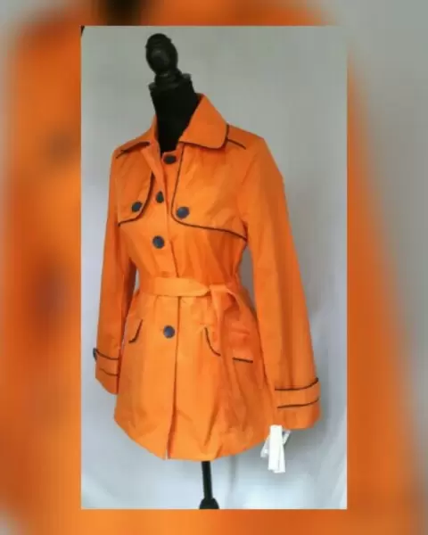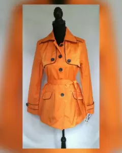 Gabardina ligera color CALABAZA, cuello clásico c/solapas, 2 solapas antitormenta frontal, cierre p/botonadura, 2 bolsillos frontales c/tapeta, cinturón mismo tejido p/mejor ajuste, bies en contraste tono NEGRO ÉBANO y forro interior. Talla M. Dimens cms: 39 hombro, 50 axila, 43 cintura, 59 zona baja, 79 largo, 64 largo manga. 55% algodón, 45% poliéster. P/lavado en casa.***NO ES IMPERMEABLE***
