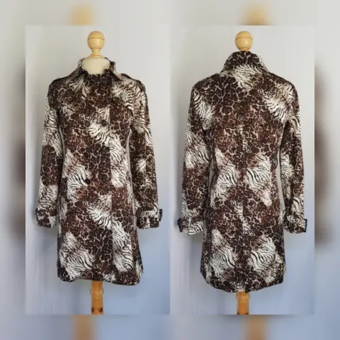 Gabardina ligera efecto ANIMAL PRINT, cuello clásico c/solapas muesca, cierre p/botonadura doble, 2 bolsos vivo c/tapeta, charreteras en hombros, cinturón c/hebilla mismo tejido y trabillas, manga larga terminada en tira c/hebilla y forro interior. Talla M. Dimensiones cms: 41 hombro, 50 axila, 46 cintura, 71 zona baja, 88 largo, 60 largo manga. 55.3% Algodón, 43% paste, 1.7%spandex. P/lav en casa***NO ES IMPERMEABLE***LA TELA ES RIGÍDA, NO ESTIRA***LA GABARDINA ES MUY BONITA, LAS FOTOS NO LE HACEN JUSTICIA***