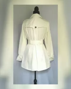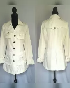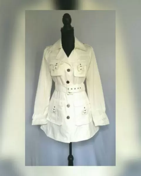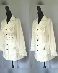 Gabardina ligera en tela color MARFIL, cuello clásico c/solapas, cierre p/botonadura, 2 bolsos parche c/tapeta/tira/hebilla, 2 bolsos plastrón c/tapeta/tira/hebilla, charreteras en hombros, cinturón c/hebilla mismo tejido y trabillas, manga larga terminada en tira c/hebilla y forro interior. Talla M. Dimensiones cms: 42 hombro, 54 axila, 48 cintura, 67 zona baja, 76 largo, 62 largo manga. 100% poliéster. Para lavado en casa.***NO ES IMPERMEABLE***