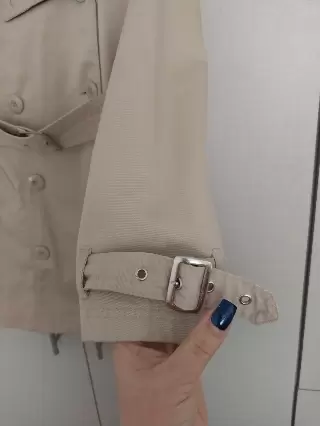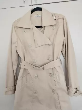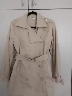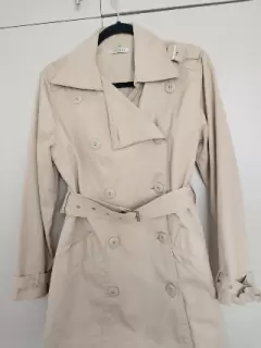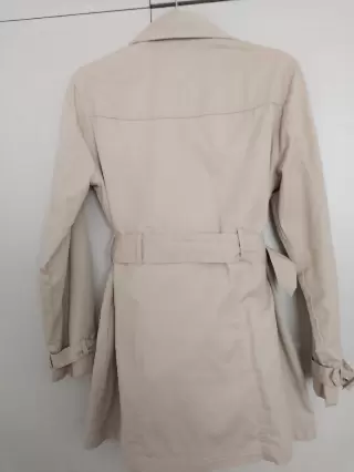 Gabardina ligera Kaki. Básica en tu closet! Impecable !!Ligera pero abrigadora a la vez, con detalles en las mangas, hombros y cinturón ancho que estiliza la figura, cuenta con forro.Va desde una talla XS, S a una MMedidas:Hombro a hombro: 43 cmAxila a axila: 53 cmCintura: 44 cmLargo: 77 cm