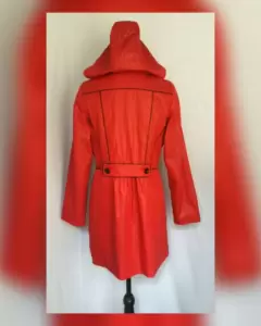 Gabardina lightwear (water resistant/breathable) en tela color ROJO FUEGO efecto brillo, capucha integrada desmontable p/botonadura, cuello clásico c/ruffle, cierre p/botonadura, tira trasera en cintura, 2 bolsos vivo frontales c/tapeta y botonadura, bies en contraste tono NEGRO ÉBANO y forro interior de fantasía . Talla M. 38 hombro, 52 axila, 45 cintura, 64 zona baja, 79 largo, 61 largo manga. 100% poliéster. Para lavado en casa.***Prenda tratada con nanotecnología que le permite soportar lluvias de ligeras a medias y ser totalmente transpirable y ligera.***EL TONO ROJO DE LA GABARDINA ES MUY INTENSO, BELLO Y BRILLANTE, LA FOTOGRAFÍA NO CAPTA SU BELLEZA***