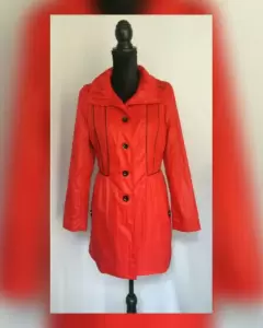 Gabardina Lightwear Impermeable Bies. Gabardina lightwear (water resistant/breathable) en tela color ROJO FUEGO efecto brillo, capucha integrada desmontable p/botonadura, cuello clásico c/ruffle, cierre p/botonadura, tira trasera en cintura, 2 bolsos vivo frontales c/tapeta y botonadura, bies en contraste tono NEGRO ÉBANO y forro interior de fantasía . Talla M. 38 hombro, 52 axila, 45 cintura, 64 zona baja, 79 largo, 61 largo manga. 100% poliéster. Para lavado en casa.***Prenda tratada con nanotecnología que le permite soportar lluvias de ligeras a medias y ser totalmente transpirable y ligera.***EL TONO ROJO DE LA GABARDINA ES MUY INTENSO, BELLO Y BRILLANTE, LA FOTOGRAFÍA NO CAPTA SU BELLEZA***