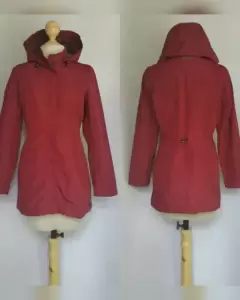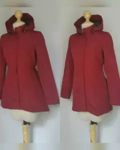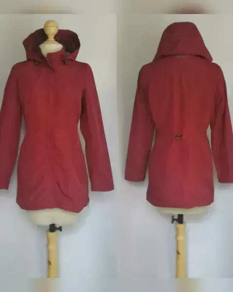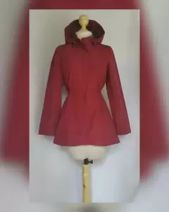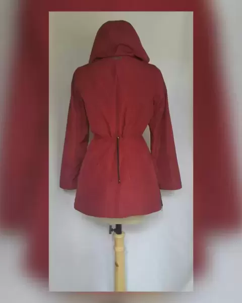 Gabardina lightwear (water resistant/breathable) en tela color VINO TINTO efecto brillo, capucha integrada NO DESMONTABLE, cremallera, herrrajes tono oro envejecido, elástico ajustable en cintura, cremalleras en costados. Talla M. 37.5 hombro, 54 cms axila, 45.5 cms cintura, 60 cms zona baja, 70 cms largo, 60.5 cms largo manga. 100% poliester. Lavado en seco.***Prenda tratada con nanotecnología que le permite soportar lluvias de ligeras a medias y ser totalmente transpirable y ligera.***