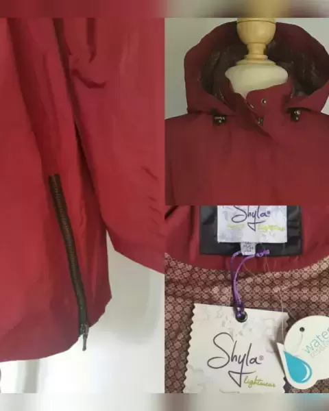 Gabardina Lightwear Impermeable Capucha. Gabardina lightwear (water resistant/breathable) en tela color VINO TINTO efecto brillo, capucha integrada NO DESMONTABLE, cremallera, herrrajes tono oro envejecido, elástico ajustable en cintura, cremalleras en costados. Talla M. 37.5 hombro, 54 cms axila, 45.5 cms cintura, 60 cms zona baja, 70 cms largo, 60.5 cms largo manga. 100% poliester. Lavado en seco.***Prenda tratada con nanotecnología que le permite soportar lluvias de ligeras a medias y ser totalmente transpirable y ligera.***
