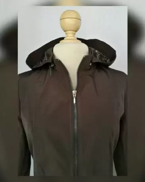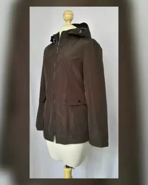 Gabardina lightwear (water resistant/breathable) en tela color TABACO efecto brillo, cierre p/cremallera, cuello Perkins, capucha DESMONTABLE p/cremallera, 2 bolsos vivo c/cremallera, tapeta y snap y forro de fantasía interior. Talla M. Dimensiones: 37 hombro, 53 axila, 47 cintura, 60 zona baja, 70 largo, 60 largo brazo. 100% poliéster. P/lavado en seco.***LA GABARDINA TIENE UN BRILLO MUY BELLO QUE NO CAPTA LA FOTOGRAFÍA***Prenda tratada con nanotecnología que le permite soportar lluvias de ligeras a medias y ser totalmente transpirable y ligera.***