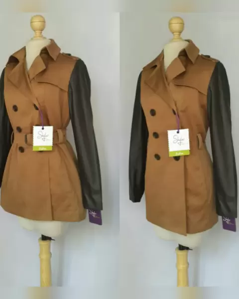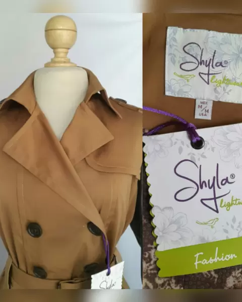 Gabardina lightwear (water resistant/breathable) color BRONCE, cuello clásico c/solapas muesca, charreteras en hombros, solapa antitormenta, cierre p/botonadura doble, 2 bolsos vivo frontales, trabillas en cintura, cinturon mismo tejido p/mejor ajuste, mangas en fake fur y forro interior fantasía. Talla M. Dimens cms: 40 hombro, 57 axila, 49 cintura, 62 zona baja, 75 largo, 61 largo manga. 63% poliester, 33% algodon, 4% elastano. Para lavado en seco.***LA GABARDINA TIENE UN BRILLO MUY BELLO QUE NO CAPTA LA FOTOGRAFÍA***Prenda tratada con nanotecnología que le permite soportar lluvias de ligeras a medias y ser totalmente transpirable y ligera.***