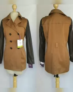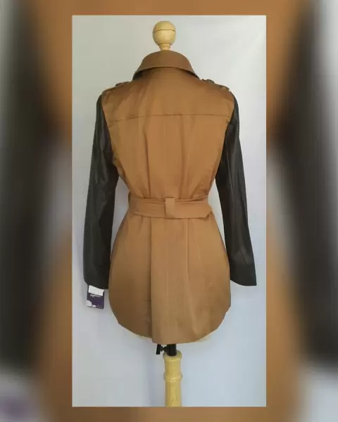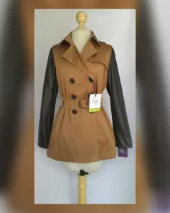 Gabardina Lightwear Impermeable c/Fake Fur. Gabardina lightwear (water resistant/breathable) color BRONCE, cuello clásico c/solapas muesca, charreteras en hombros, solapa antitormenta, cierre p/botonadura doble, 2 bolsos vivo frontales, trabillas en cintura, cinturon mismo tejido p/mejor ajuste, mangas en fake fur y forro interior fantasía. Talla M. Dimens cms: 40 hombro, 57 axila, 49 cintura, 62 zona baja, 75 largo, 61 largo manga. 63% poliester, 33% algodon, 4% elastano. Para lavado en seco.***LA GABARDINA TIENE UN BRILLO MUY BELLO QUE NO CAPTA LA FOTOGRAFÍA***Prenda tratada con nanotecnología que le permite soportar lluvias de ligeras a medias y ser totalmente transpirable y ligera.***