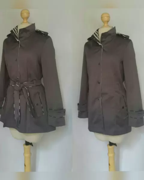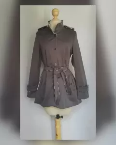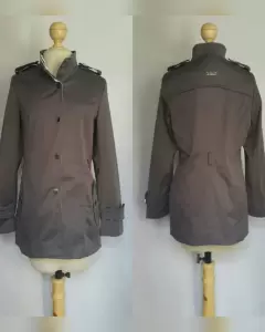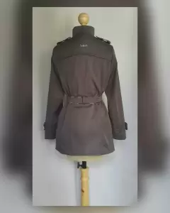 Gabardina lightwear (water resistant/breathable) color GRIS LOBO, cuello Perkins, cierre p/snaps, 2 bolsos vivo frontales ocultos p/tapeta y snaps, efecto bies en contraste zonas bolsos, cinturón, charreteras y tiras, solapa antitormenta trasera, charreteras en hombros, placa metálica c/logotipo de la marca en espalda, trabillas en cintura para mejor ajuste, manga larga terminada en tira c/snaps, cinturón mismo tejido p/ mejor ajuste y forro interior. Talla G. Dimensiones cms: 39 hombro, 52 axila, 46 cintura, 61 zona baja, 73 largo, 60 largo manga. 60% poliéster, 37% algodón, 3% elastano. Para lavando en seco.***Prenda tratada con nanotecnología que le permite soportar lluvias de ligeras a medias y ser totalmente transpirable y ligera.***