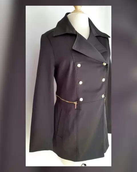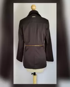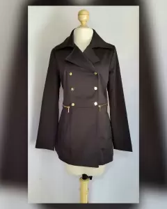 Gabardina lightwear (water resistant/breathable) en tela color NEGRO ÉBANO, cuello clásico c/solapas muesca, cierre p/botonadura doble tono dorado brillante lacrado, cremallera fantasía en cintura, 2 bolsos frontales vivo c/tapeta, placa metalica c/logotipo de la marca zona trasera y forro fantasía interior. Talla M. Dimen cms:40 hombro, 53 axila, 47 cintura, 62 zona baja, 75 largo, 60 manga. 60% poliéster, 37% algodón, 3% elastano. Para lavado en casa.***Prenda tratada con nanotecnología que le permite soportar lluvias de ligeras a medias y ser totalmente transpirable y ligera.***