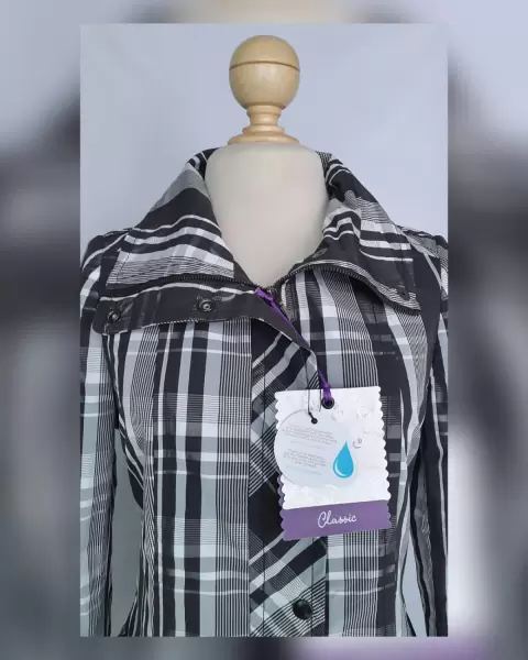 Gabardina Lightwear Impermeable Cuadros. Gabardina lightwear (water resistant/breathable) en tela cuadriculada de tonos azul cobalto, beige, gris ácero, gris oxford y negro efecto tornasol, cuello clásico con solapas, cierre mediante cremallera de carro sencillo tono negro, dos bolsos frontales ocultos por tapeta, manga larga, trabillas traseras, cinturón mismo tejido para mejor ajuste y forro interior. Talla M (da a S/M). Dimensiones: 39 cms hombro a hombro, 54 cms axila a axila, 48.5 cms cintura, 59.5 cms zona baja, 66 cms largo, 61 cms manga. 100% poliéster, forro: 100% poliéster. Para lavado en seco. ***Prenda tratada con nanotecnología que le permite soportar lluvias de ligeras a medias y ser totalmente transpirable y ligera.***