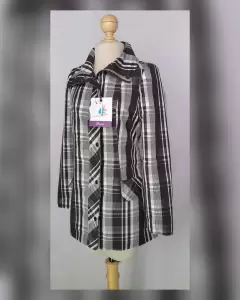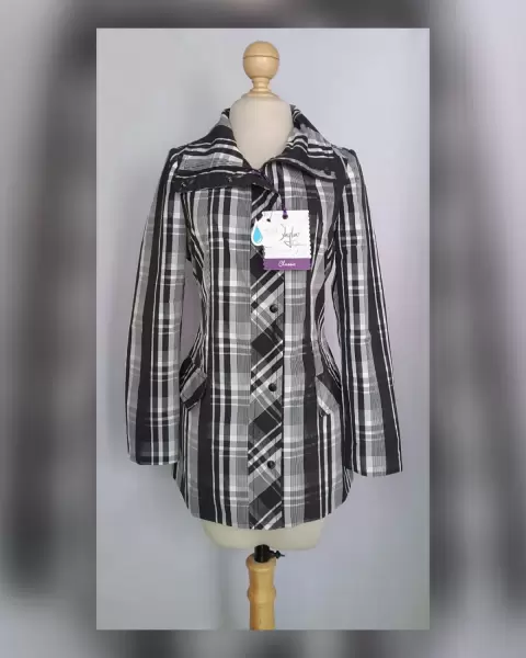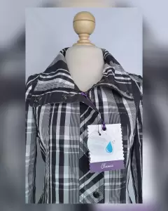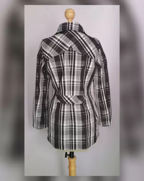 Gabardina lightwear (water resistant/breathable) en tela cuadriculada de tonos azul cobalto, beige, gris ácero, gris oxford y negro efecto tornasol, cuello clásico con solapas, cierre mediante cremallera de carro sencillo tono negro, dos bolsos frontales ocultos por tapeta, manga larga, trabillas traseras, cinturón mismo tejido para mejor ajuste y forro interior. Talla M (da a S/M). Dimensiones: 39 cms hombro a hombro, 54 cms axila a axila, 48.5 cms cintura, 59.5 cms zona baja, 66 cms largo, 61 cms manga. 100% poliéster, forro: 100% poliéster. Para lavado en seco. ***Prenda tratada con nanotecnología que le permite soportar lluvias de ligeras a medias y ser totalmente transpirable y ligera.***