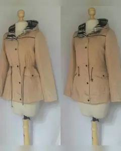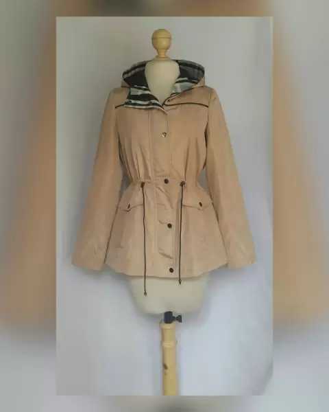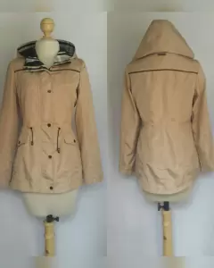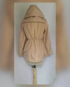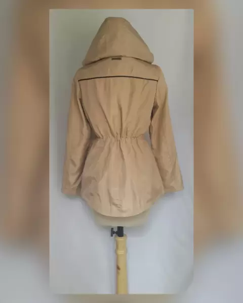 Gabardina lightwear (water resistant/breathable) en tela color TRIGO efecto brillo, capucha integrada no desmontable, cremallera, herrrajes tono plomo brillante, elástico ajustable en cintura, bolsos frontales. Talla M. 37 hombro, 52.5 cms axila, 45 cms cintura, 59 cms zona baja, 70 cms largo, 59.5 cms largo manga. 100% poliester. Lavado en seco.
