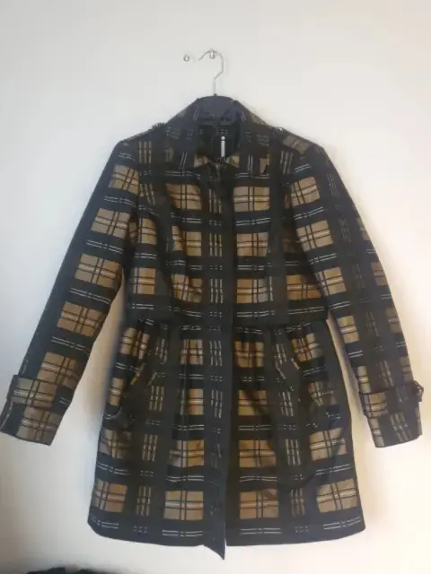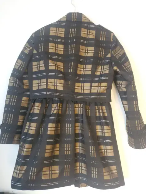 Gabardina estampada, colores cafe,negro y dorado, se ajusta al cuerpo y hace que se te vea una figura muy bonita