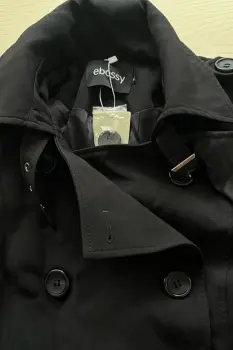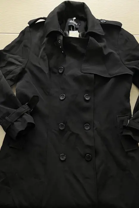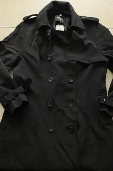 Gabardina negra larga el diseño viene con doble fila de botones, bolsillos laterales y solapa en la parte de arriba del cuello. ojo el diseño viene sin cinturon, solo es medio cinto ver 3 foto.Medidas:Hombro a hombro: 50 cmAxila a axila: 63 cmLargo: 132 cm