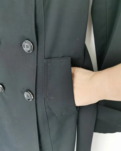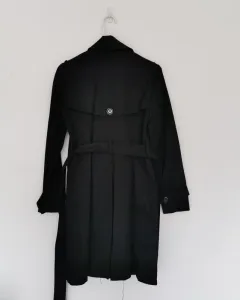 Gabardina de tela tipo lona. Color negro. Frente cruzado de 4 botones. Cuello con solapa amplia. Bolsillos de jareta con solapa al frente para meter las manos. Solapas al frente y en la espalda, la de la espalda tiene botón. Banda de tela a la cintura. En los puños de las mangas tiene cinturones para ajustar el ancho. Talla S.