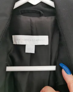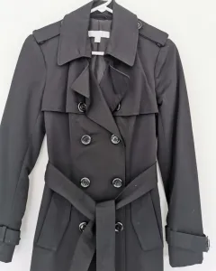 Gabardina negra New York & Company. Gabardina de tela tipo lona. Color negro. Frente cruzado de 4 botones. Cuello con solapa amplia. Bolsillos de jareta con solapa al frente para meter las manos. Solapas al frente y en la espalda, la de la espalda tiene botón. Banda de tela a la cintura. En los puños de las mangas tiene cinturones para ajustar el ancho. Talla S.