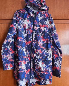 Impermeable abajo de la cadera, con capucha, dos bolsas al frente, cierre y cinta a la cintura.