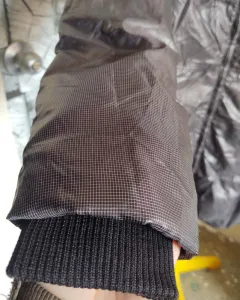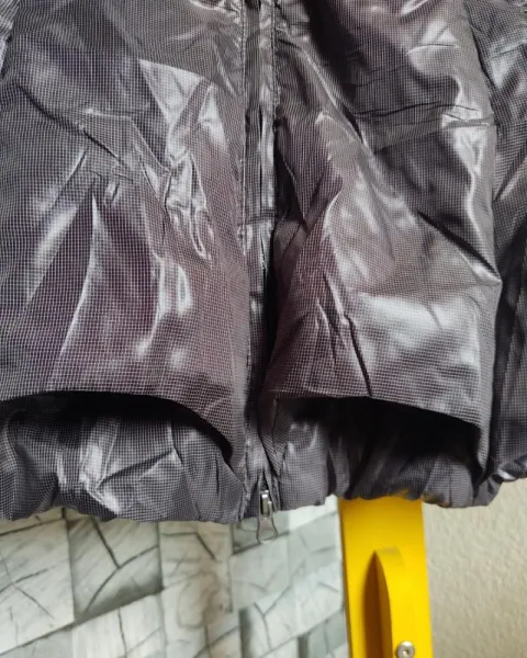 Impermeable negro tela brillosa. Impermeable color negro de cuadros muy pequeños, con gorro que no es desmontable, adornos en la parte inferior, muy cómoda y bonita.
