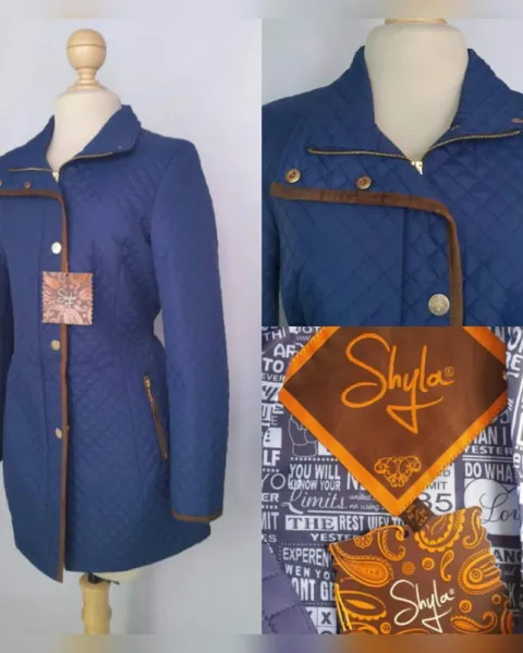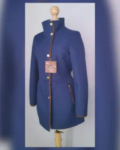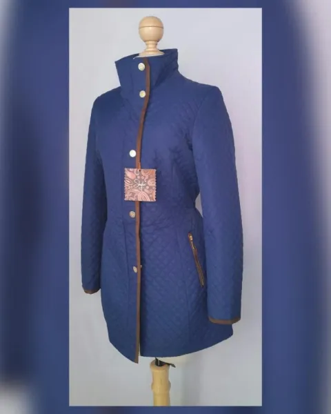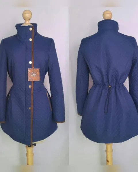 Parka Acolchada Ligera aplique Fake Fur Azul. Parka ligera acolchada tono AZUL COBALTO c/bies fake fur tono CHOCOLATE cuello/zona frontal/puños, cuello clásico convertible a cuello alzado, cierre p/cremallera oculta p/tapeta c/snaps, 2 bolsos vivo c/cremallera, elástico trasero ajustable cintura y forro interior fantasía. Talla M. Dimens cms: 39 hombro, 52 axila, 46 cintura, 62 zona baja, 81 largo, 60 largo manga. 100% poliéster. P/lav seco
