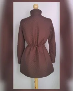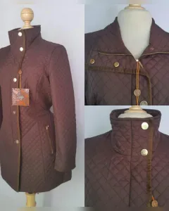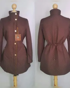 Parka ligera acolchada tono TABACO c/bies fake fur tono CHOCOLATE cuello, zona frontal y puños, cuello clásico convertible a cuello alzado, cierre p/cremallera oculta p/tapeta c/snaps, 2 bolsos vivo c/cremallera, elástico trasero ajustable cintura y forro interior fantasía. Talla M. Dimens cms: 39 hombro, 53 axila, 46 cintura, 62 zona baja, 81 largo, 59 largo manga. 100% poliéster. P/lavado seco