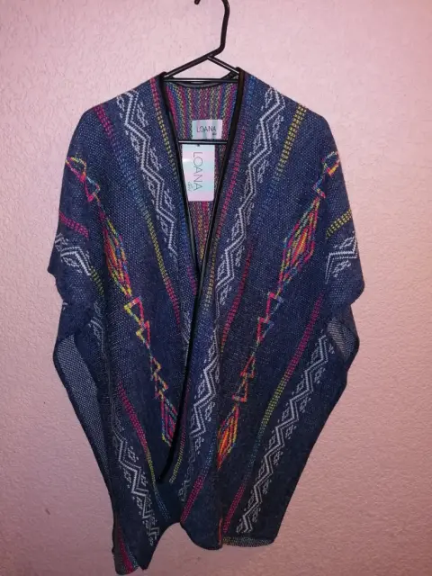 Poncho estilo abierto, color azul con motivos multicolor, tejido suaveUnitalla entre M y G