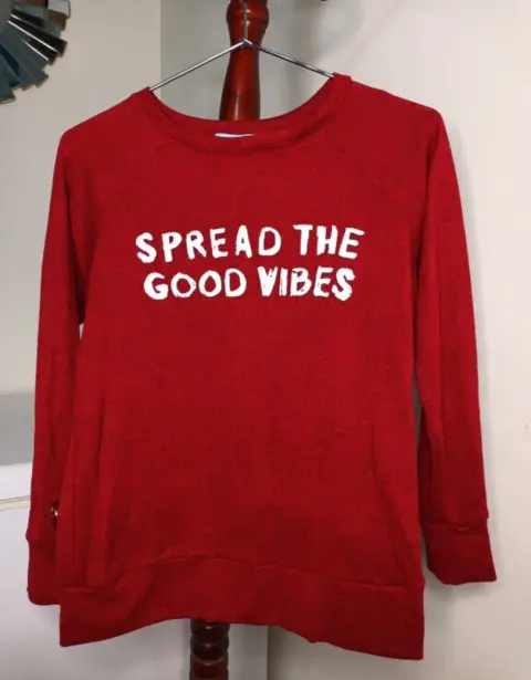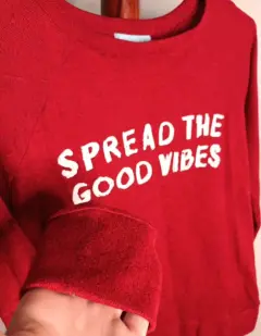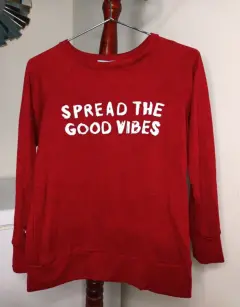 Suéter "spread the good vibes". M Puesto una vezUp&down✨Suéter de tela de algodón, cuello circular, color rojo, con ligeros detalles negros.✅ MEDIDAS:- Largo: 56 cm.- Hombro: 33 cm.- Busto: 82 cm.- Cintura: 82 cm.- Largo manga: 53.5 cm