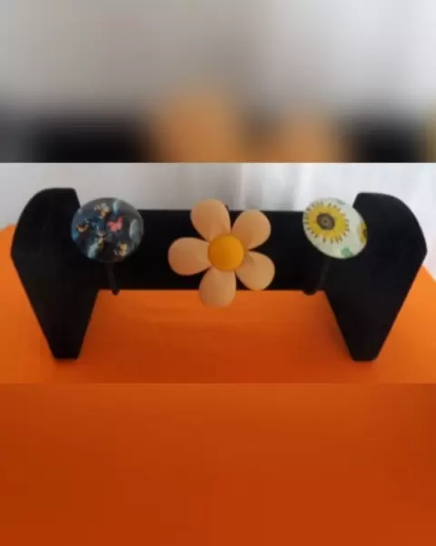 Paquete de 3 bandas para hacer coletas en el cabello en forma de flor, y circulos con estampado de mariposas y girasoles en tonos azules, tierra, durazno, amarillo, verde, blanco y negro.