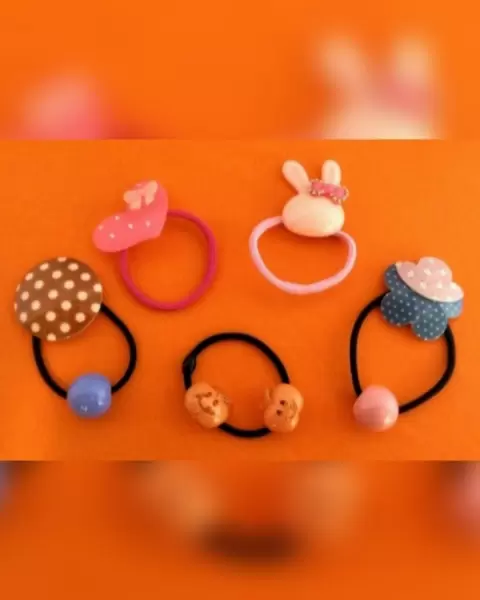 Paquete de 5 bandas para hacer coletas en el cabello en forma de manzanas, conejo, circulo, corazón y flor con sombrero en tonos rosas, azules, tierra, durazno y negro con aplique de bisutería translúcida y rosa bebé.