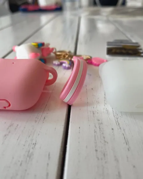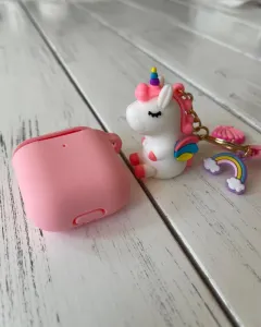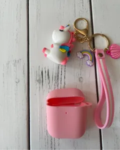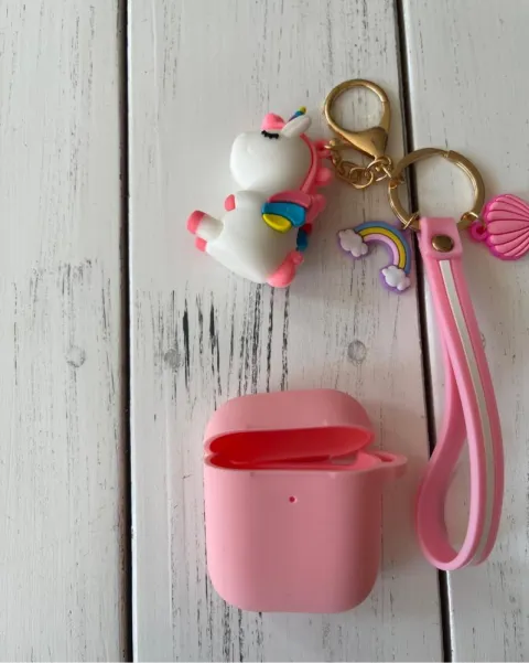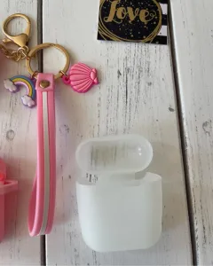 2 fundas para AirPods con llavero. El llavero es de goma suave, la funda rosa se engancha al llavero, la funda blanca brilla en la oscuridad. Ambas de silicona flexible.