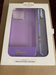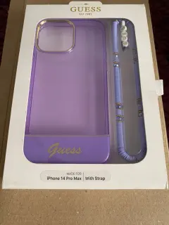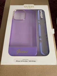 Funda Guess 14 pro Max. Funda color morado con correa de la marca Guess para iPhone morado increíble diseño