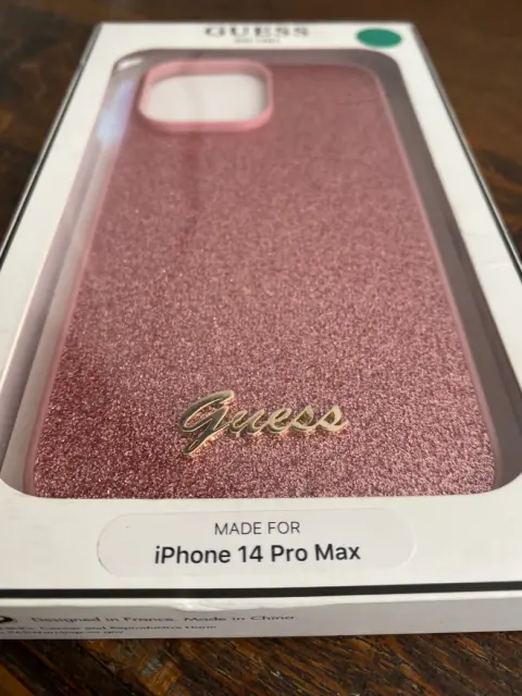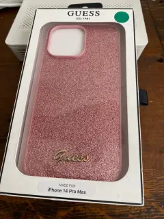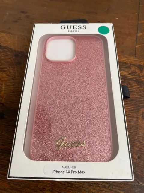 Funda para el iPhone 14 Pro Max de la marca Guess diseño increíble de brillos color rosa