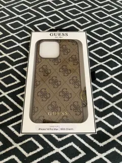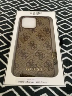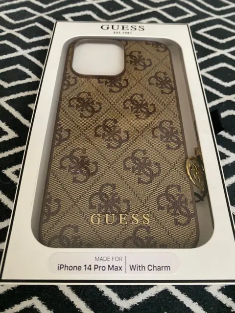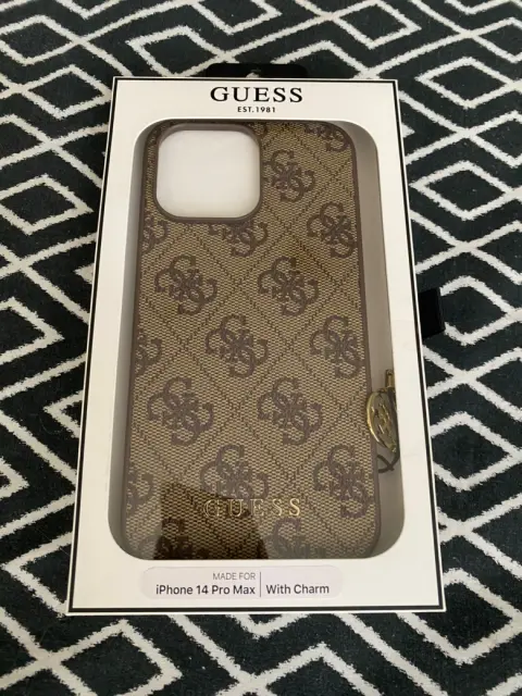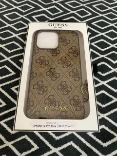 Funda Guess iPhone 14 Pro Max. Funda de la marca iPhone color café diseño increíble de la marca Guess con charm