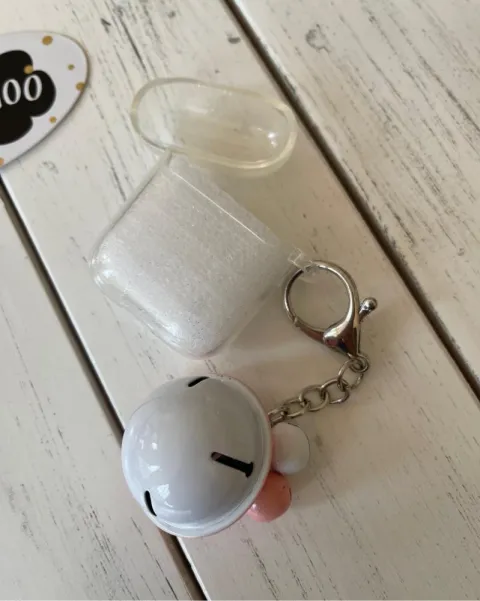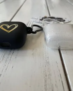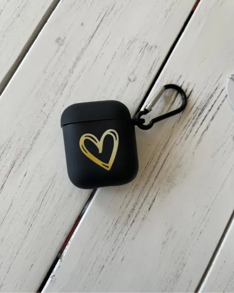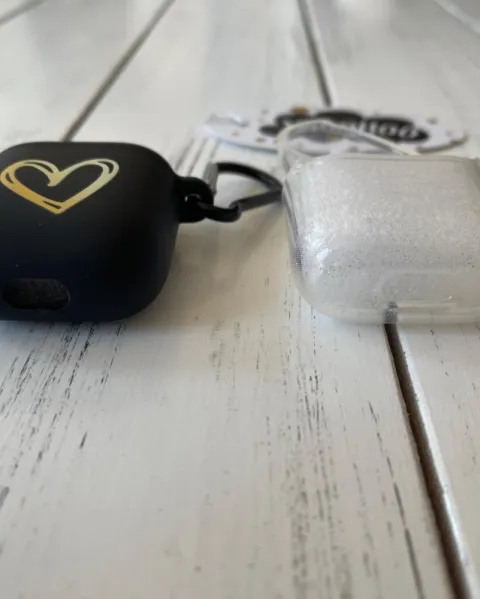 2 fundas para AirPods una transparente con glitter y llavero de sonaja, otra negra con diseño de corazón dorado al frente.