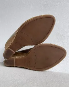 Alpargatas altas Schutz. Color arenaTalla: 5 americano, que es 2 mexicano, considero podría quedar a número 2 y 2.5Mide por dentro: 23 cm Altura del tacón: 10 cm Plataforma: 1 cmAlpargatas altas de tacón corrido, los detalles que tienen se ven en las fotos. Por dentro se les ha caído el recubrimiento.