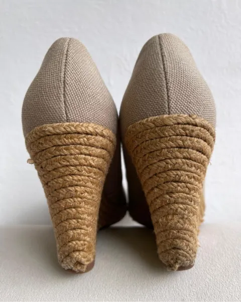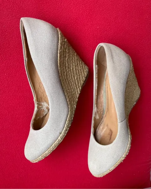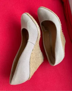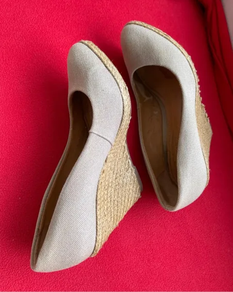 Color arenaTalla: 5 americano, que es 2 mexicano, considero podría quedar a número 2 y 2.5Mide por dentro: 23 cm Altura del tacón: 10 cm Plataforma: 1 cmAlpargatas altas de tacón corrido, los detalles que tienen se ven en las fotos. Por dentro se les ha caído el recubrimiento.