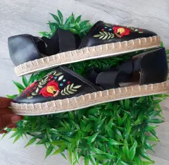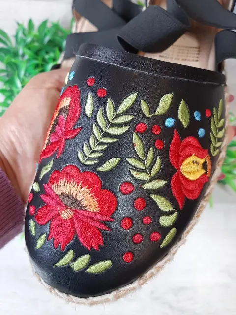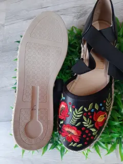Alpargatas bordadas. Bellísimas Alpargatas nuevas, de piel sintético con flores bordadas, de suela plana de 3.5 centímetros de altura, con costura alrededor. Correas elásticas que van cruzadas. Ideal para lucir un atuendo patriótico. Fabricadas en México. Sólo se sacaron de su caja.