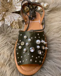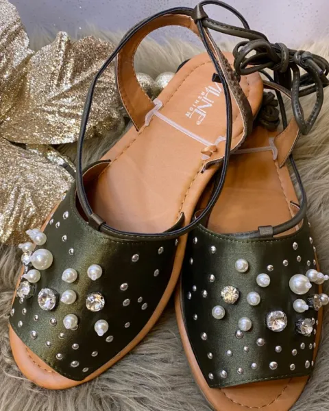Hermosas sandalias verde olivo con lindos detalles de perlas y piedritas brillantes, con cintillas que decorarán tus piernas. Súper cómodas y muy adecuadas para la temporada. Talla: 26 México. ¡Producto nuevo en tendencia!