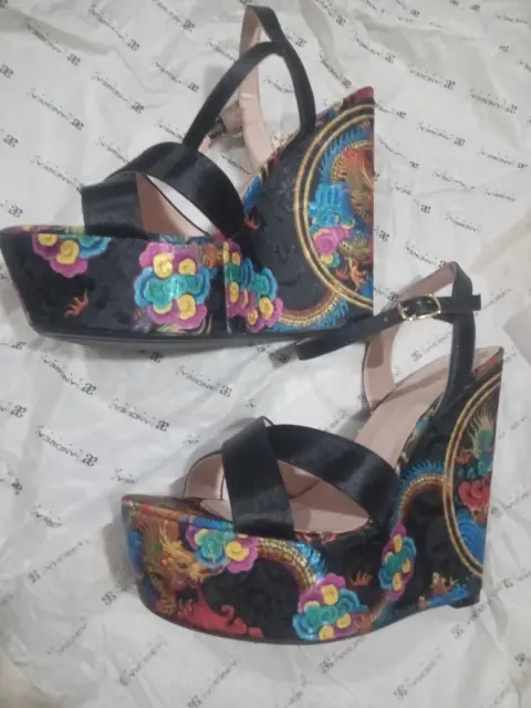 Zapatillas de plataforma tipo alpargata negras con detalles en colores florales, negra, talla 5 muy comodas