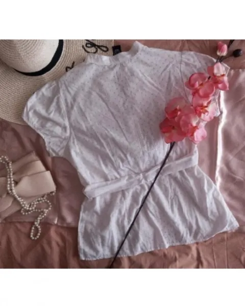 4 PRENDAS X 300. Blusa blanca básica se ajusta a l cintura, manga corta, tiene estampado de puntos