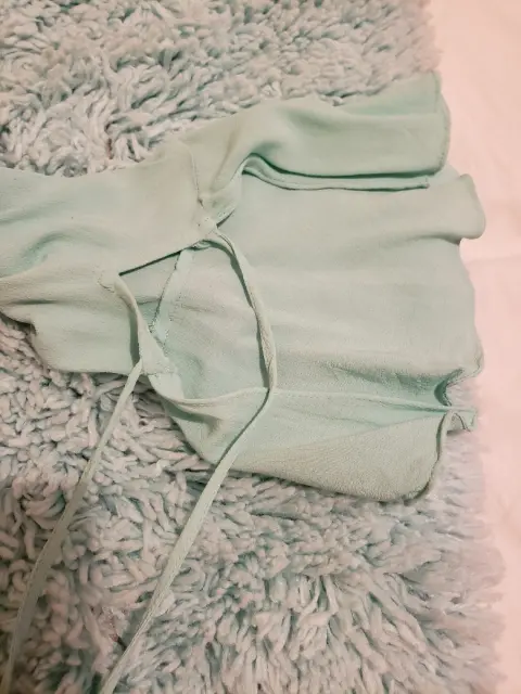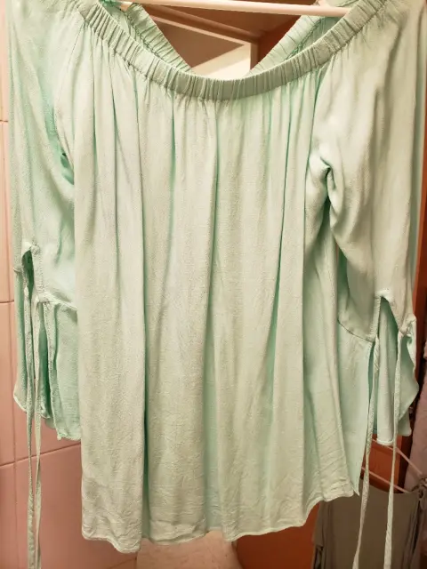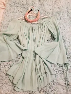 Hermosa blusita tipo campesina, tela 100% viscosa, manga de campana con agujetas y agujeta enfrente, resorte en el cuello de hojal, medidas: 96 cms de diámetro cuello sin estirar, trae resorte, axilas 108 cms de diámetro, 55 cms largo, color verde menta.