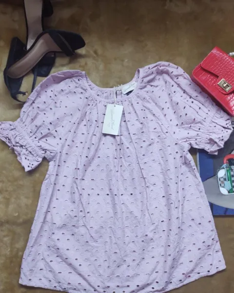LINDA BLUSA CLOR LILA CON MANGA TIPO GLOBLO Y HERMOSO ACABADO DE PAPEL PICADO, LIGERA Y CUELLO REDONDO▫️Marca: UNIVERSAL THREAD ▫️ TALLA: S