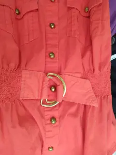 Hermoso color naranja, botones metálicos, media espalda, bellos detalles en la cintura