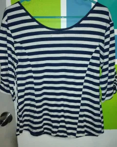 Bonita blusa Marca Sahara Nueva sin etiqueta sin ningún detalle, la tela es delgada para tiempos de calor. Color azul marino con blanco rayada. Muy bonita. Detalle de cadena en el escote.
