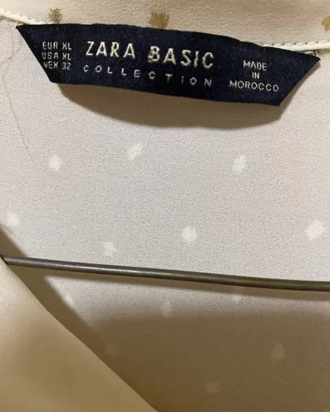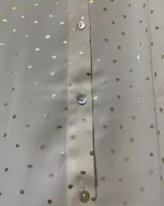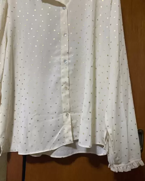 Blusa en tono crema con lunares dorados. Botones al frente y un Olán delgado en cada manga. Muy fresca, tela suave