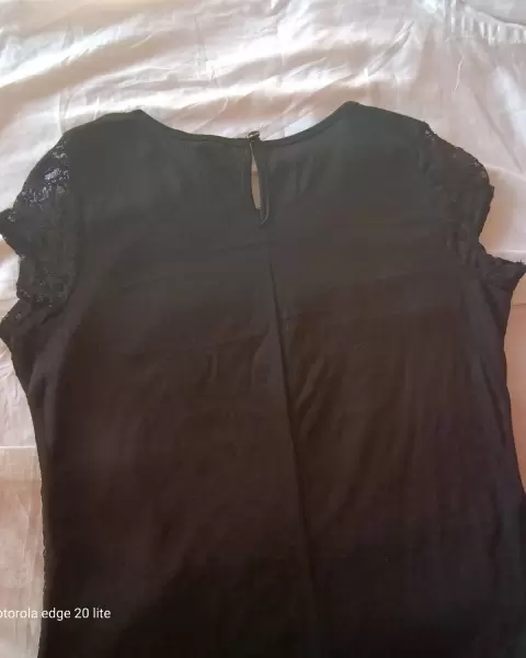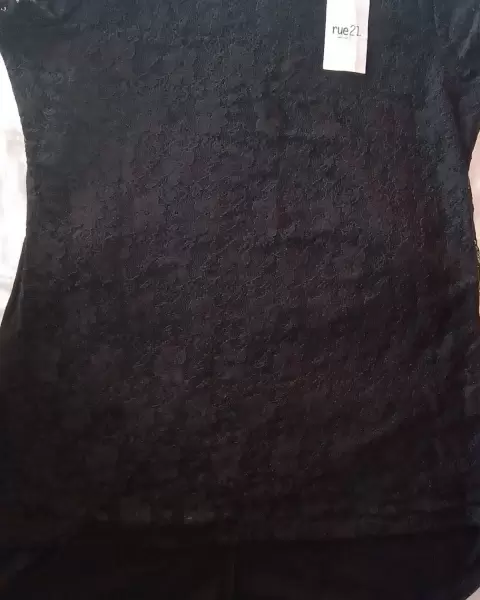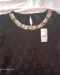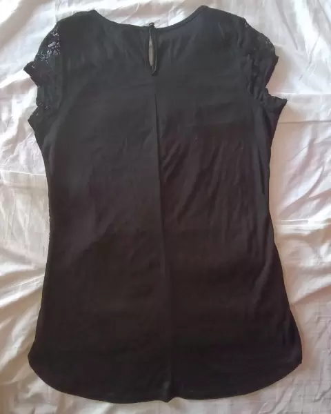Blusa color negro en talla mediana, con la parte frontal de encaje y al cuello pequeños detalles en pedrería y lentejuela, por la parte de atrás lisa y ligeramente larga.