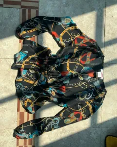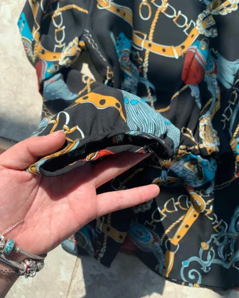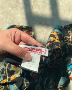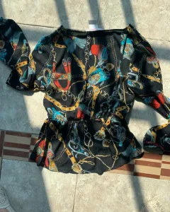 Negro con diseño, tipo peplum, hace figura muy bonita, sin detalles, colores vibrantes