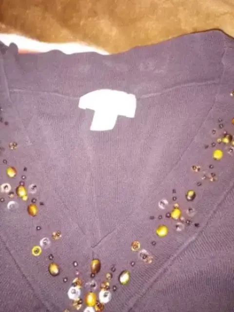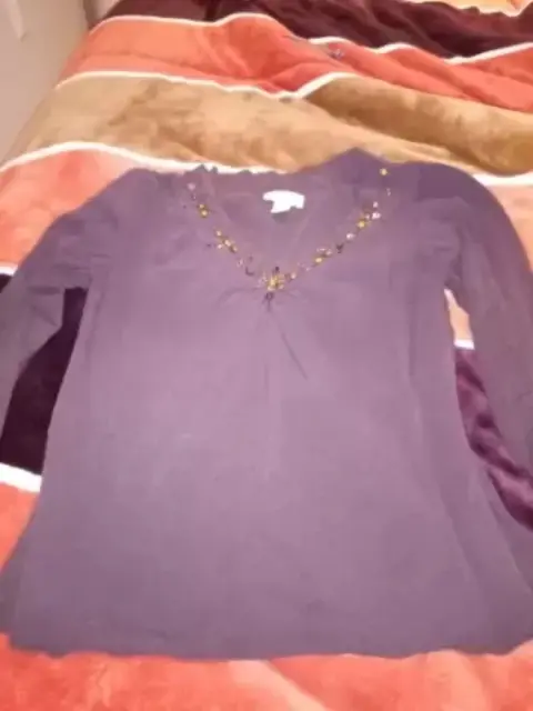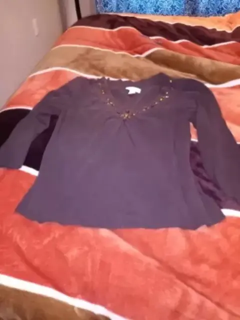 BLUSA 3/4. Es cafe, manga 3/4, cuello V, con piedritas enfrente, lisa viene amplia